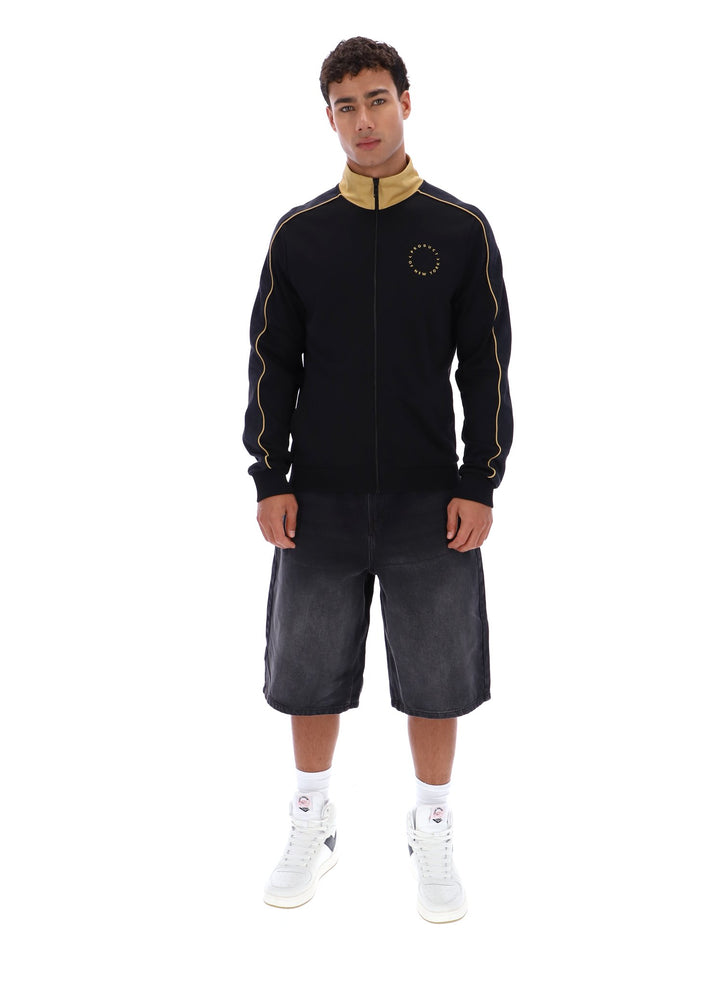 Classic funnel neck track jacket with jacquard chevron panel along arms and contrast piping detail. Featuring the Product of New York printed logo on the left chest