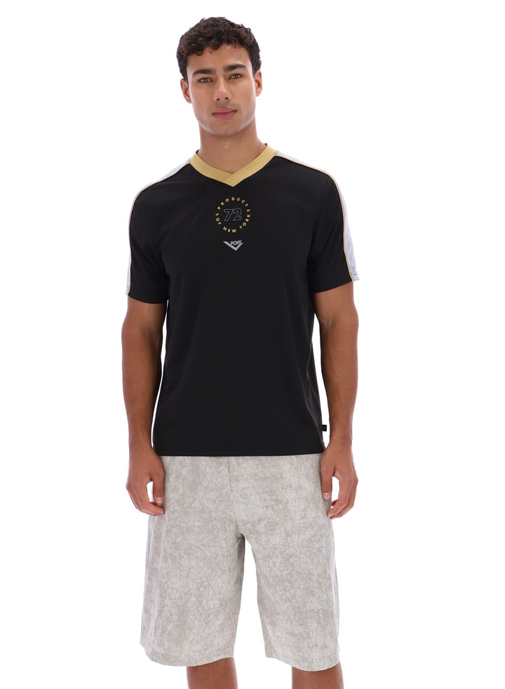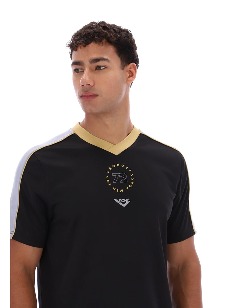A classic fit 100% polyester v neck tee featuring a 1972 PONY graphic on the chest with contrast colour panels to the shoulders and neck and a PONY woven tab label to the side seam